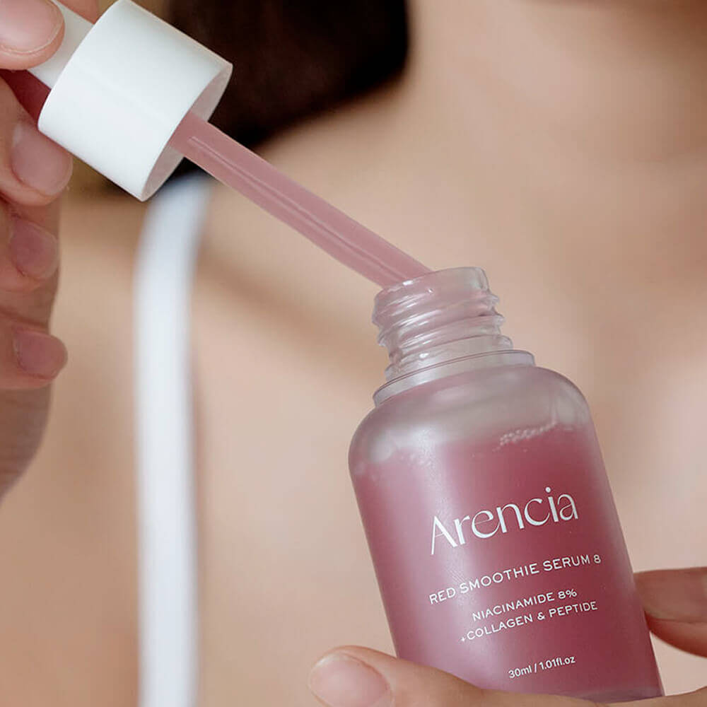 Arencia Fresh Red Smoothie Serum 8 — антивозрастная сыворотка с 8% ниацинамида уплотняет ткани и способствует сужению пор, разглаживает мимические морщины и сокращает их глубину. Запускает синтез коллагеновых волокон, повышает эластичность и замедляет старение кожи. Устраняет тусклый тон, деликатно осветляет и выравнивает текстуру. Содержит гексапептид-2, витамин С, арбутин, сахаромицеты, экстракты шиповника и женьшеня.