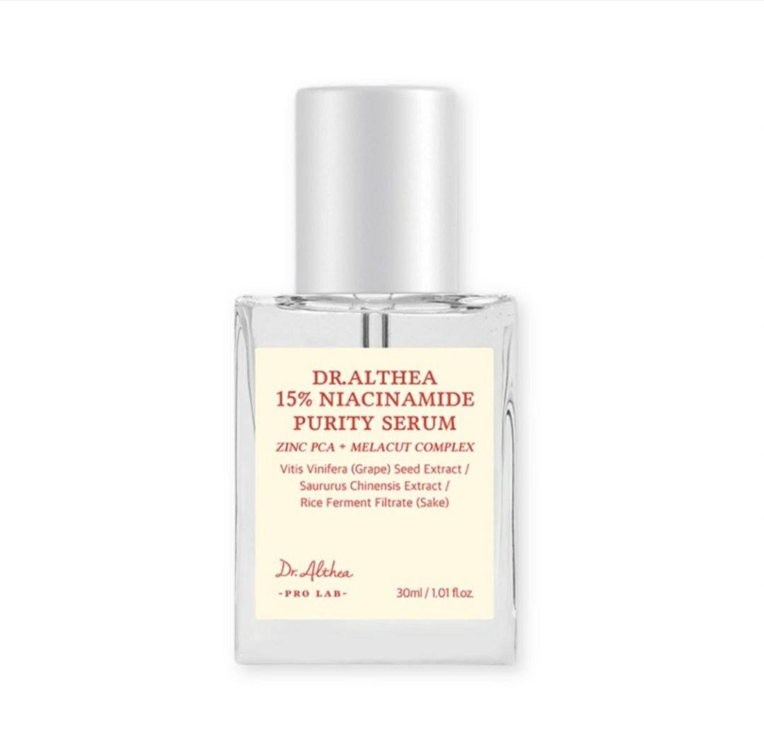 Сыворотка Dr. Althea 15% Niacinamide Purity Serum с ниацинамидом и цинком эффективно осветляет пигмент и сужает поры. Регулирует жирность, успокаивает высыпания, дарит здоровое сияние. Легкая текстура подходит для ежедневного ухода за проблемной кожей.