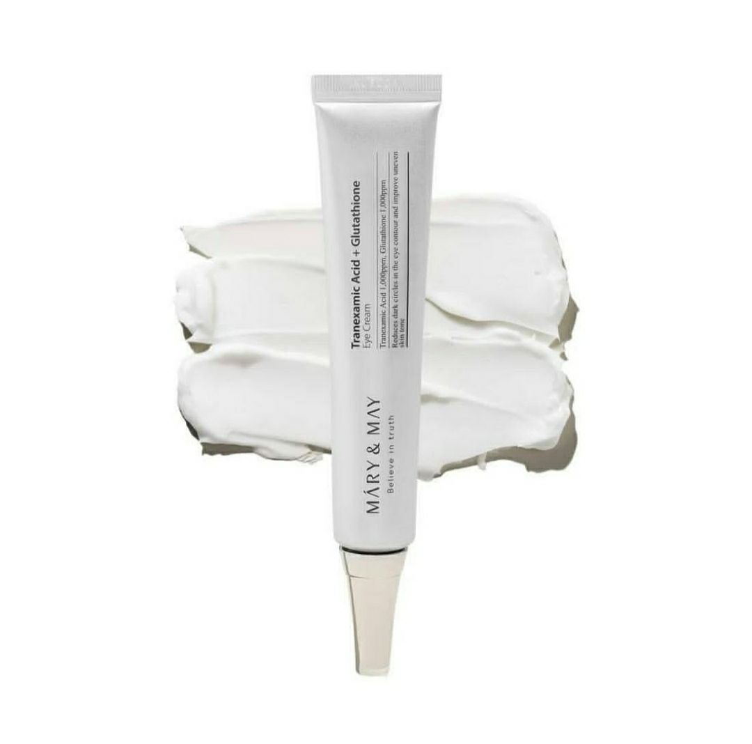 Mary&May Tranexamic Acid + Glutathion Eye Cream — осветляющий крем для век с транексамовой кислотой зоне вокруг глаз. Укрепляет нежную кожу век, устраняет сухость и стянутость, разглаживает мимические морщины. Содержит глутатион, транексамовую кислоту и витамин С.